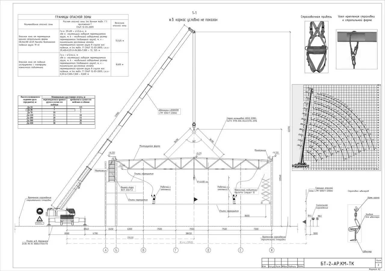 Графическая часть включает в себя технологическую схему производства работ по монтажу КМ в которой описаны мероприятия по технике безопасности во время работы крана, способы строповки, границы опасной зоны.