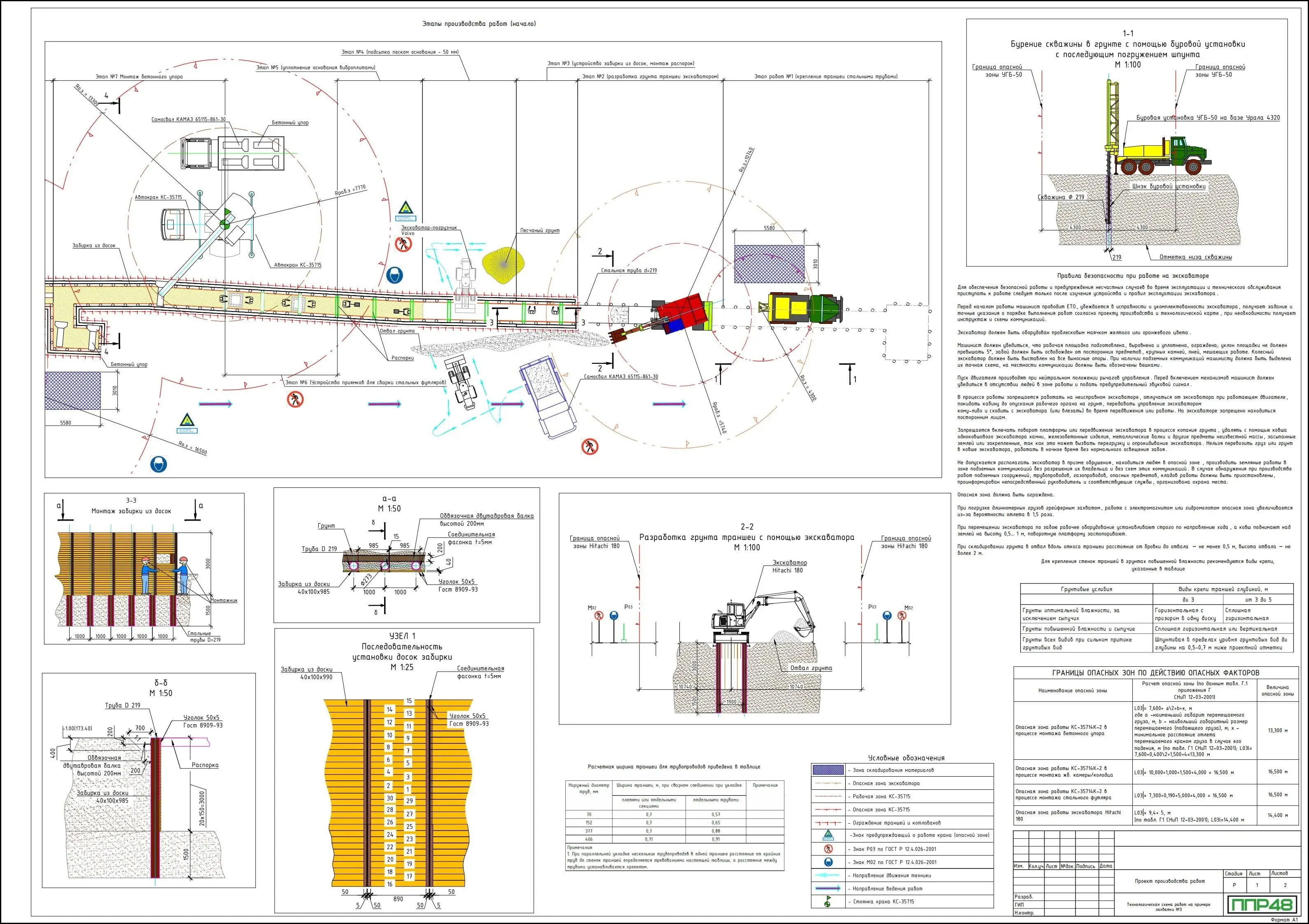 Раздел на выполнение земляных работ является неотъемлемой частью данного типа документа. При открытой прокладке НВ, перед укладкой трубопроводов, выполняют отрывку грунта траншеи. Если траншею разрабатывают в стесненных условиях, в слабых грунтах и при глубине разработки от 2 метров и более, то стены откосов крепят с помощью деревянных досок или шпунтового ограждения. На следующем строители укладывают петли трубопроводов, выполняют обратную засыпку и уплотнение.